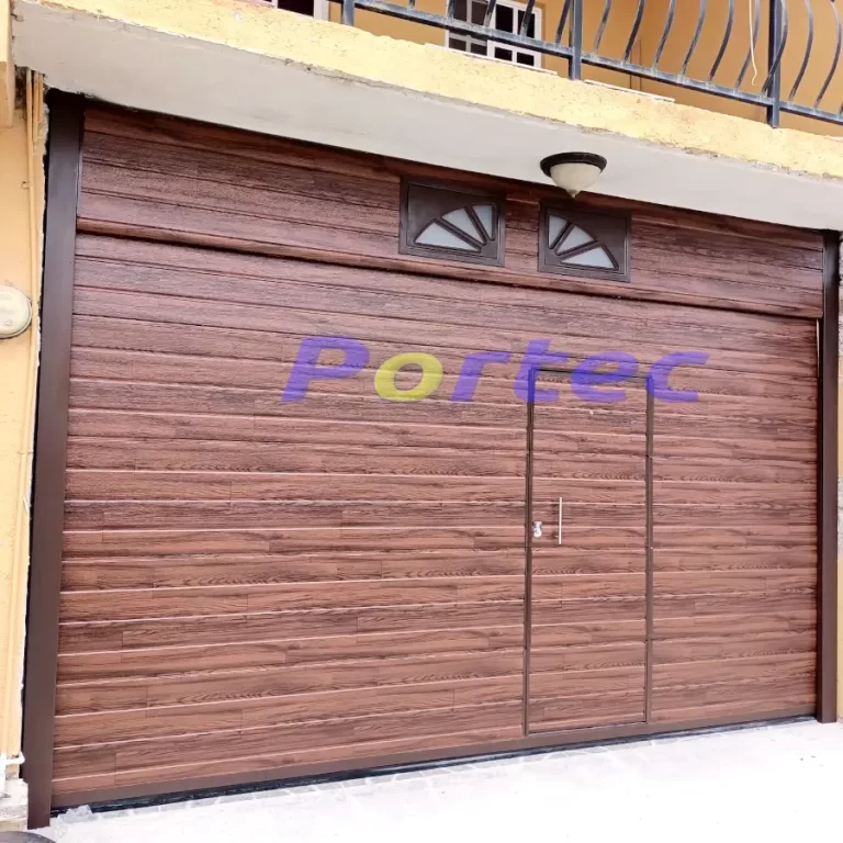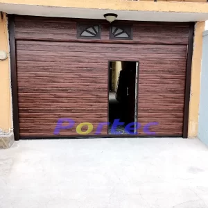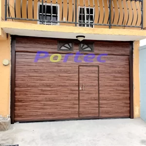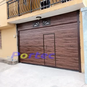 Porton levadizo panel tipo americano color madera diseño a rayas, antepecho de panel, no incluye ventanas. El porton tiene adaptacion de puerta de acceso peatonal